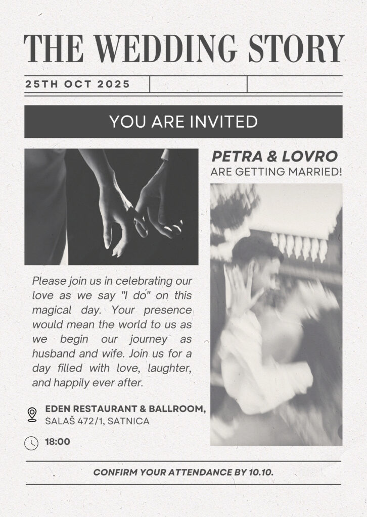 U svijetu masovne proizvodnje i brzih rješenja, Estoria se vraća detaljima, osobnom pristupu i bezvremenskoj estetici. Naš cilj je stvoriti pozivnice i materijale koji se ne bacaju, već čuvaju kao uspomena. Svaki projekt započinjemo razgovorom — jer vjerujemo da dobar dizajn počinje razumijevanjem osobe, emocije i priče iza događaja. Ne radimo prema gotovim predlošcima. Svaki dizajn je jedinstven, promišljen i estetski usklađen s vašom vizijom. U Estoriji stvaramo vizualne elemente koji u potpunosti prate atmosferu Vašeg događaja.